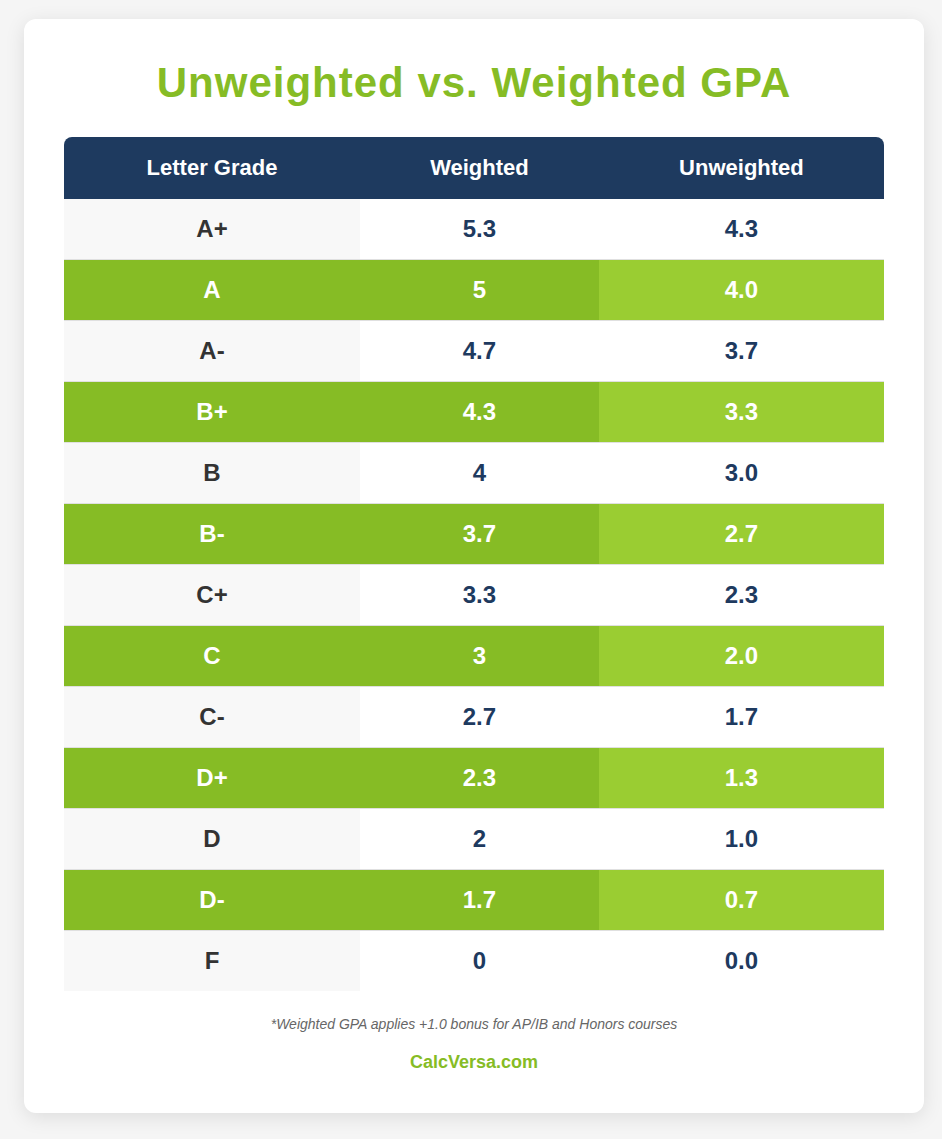 The distinction between weighted and unweighted GPA calculations represents one of the most important concepts for high school students to understand when using a GPA calculator. An unweighted GPA uses the traditional 4.0 scale where the highest possible grade point average is 4.0, treating all courses equally regardless of difficulty level. This system provides straightforward assessment of academic performance but doesn’t account for students who challenge themselves with rigorous coursework. Conversely, weighted GPA systems acknowledge advanced courses by adding bonus points, typically allowing students to exceed the 4.0 threshold and potentially reach GPAs of 4.5, 5.0, or even higher depending on the school’s weighting policy. Honors courses might receive an additional 0.5 points while AP and IB courses could add a full 1.0 point to each grade. When using a grade calculator, students must specify whether they want weighted or unweighted calculations, as this dramatically affects the resulting GPA. Understanding both calculations allows students to present the most favorable GPA when appropriate while recognizing which metric specific colleges prefer during the admissions process.